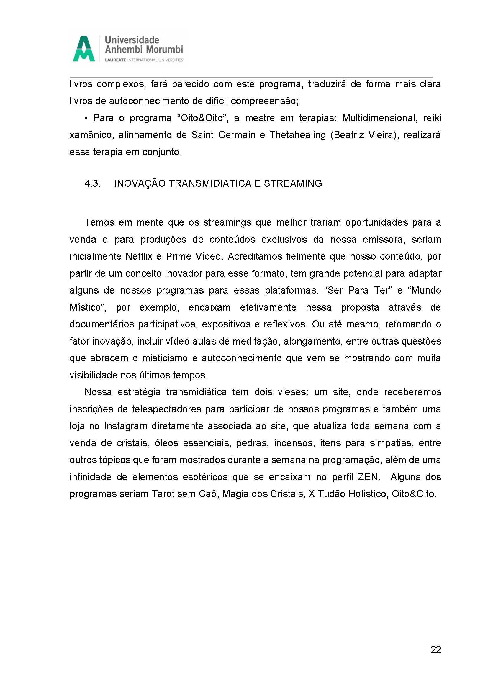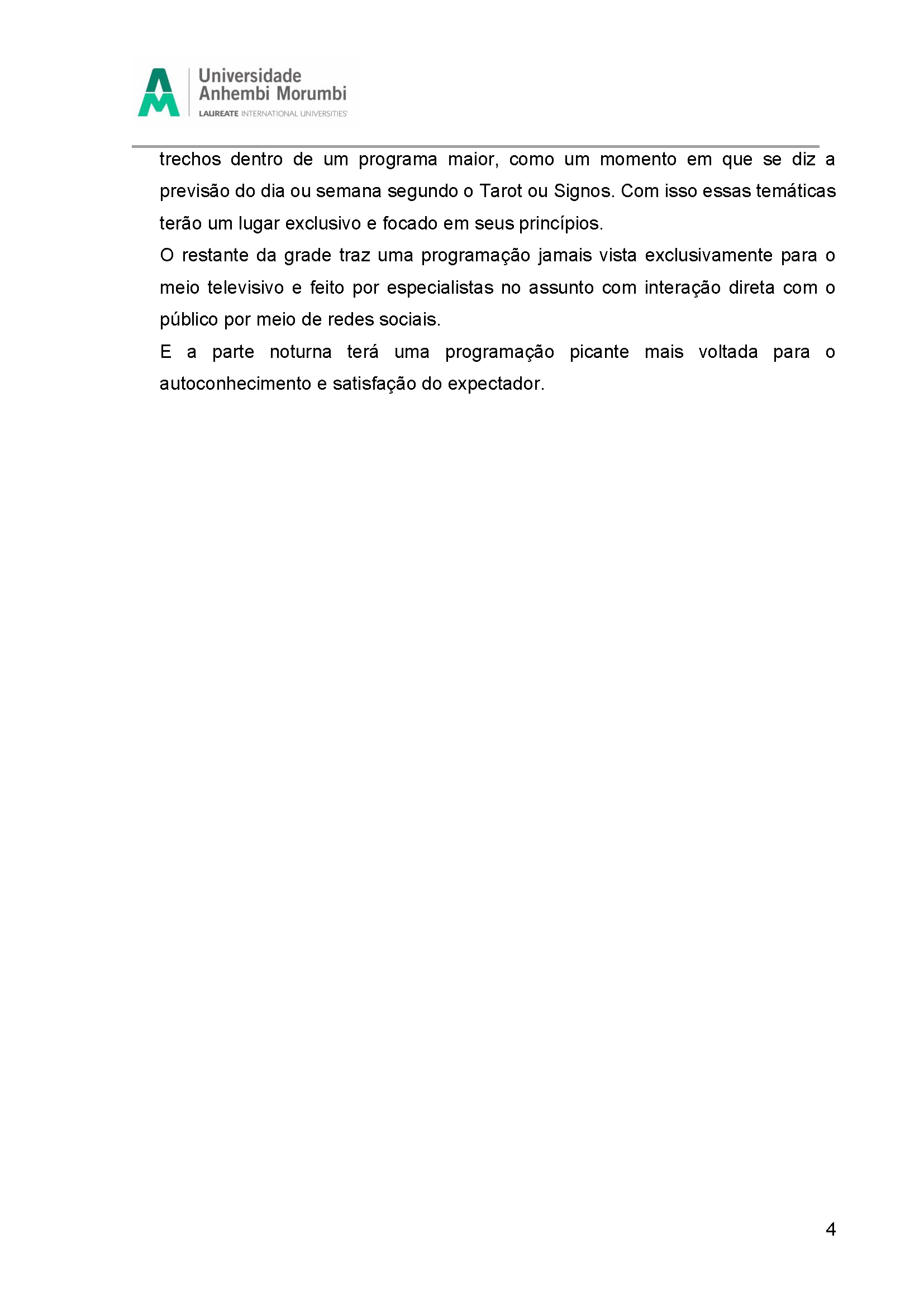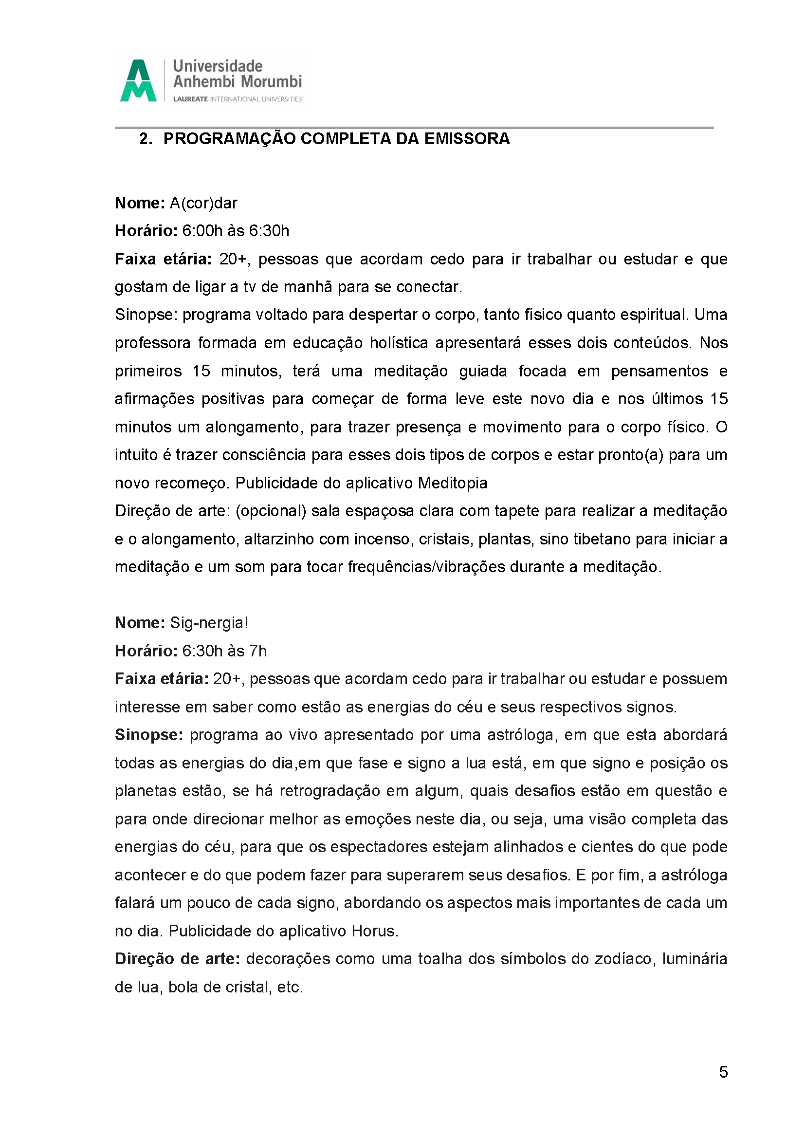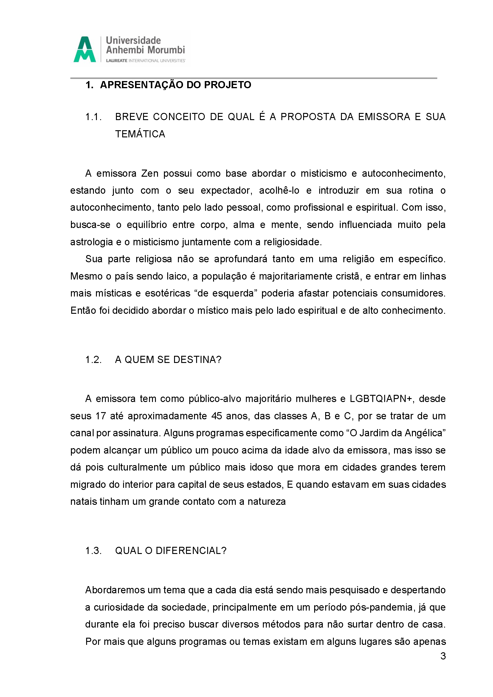 Fruto da disciplina de Programação, Audiência e Negócios foi criado como projeto piloto a Emissora Zen, que possui como base abordar o misticismo e autoconhecimento, estando junto com o seu expectador, acolhê-lo e introduzir em sua rotina o autoconhecimento, tanto pelo lado pessoal, como profissional e espiritual. Com isso, busca-se o equilíbrio entre corpo, alma e mente, sendo influenciada muito pela astrologia e o misticismo juntamente com a religiosidade.