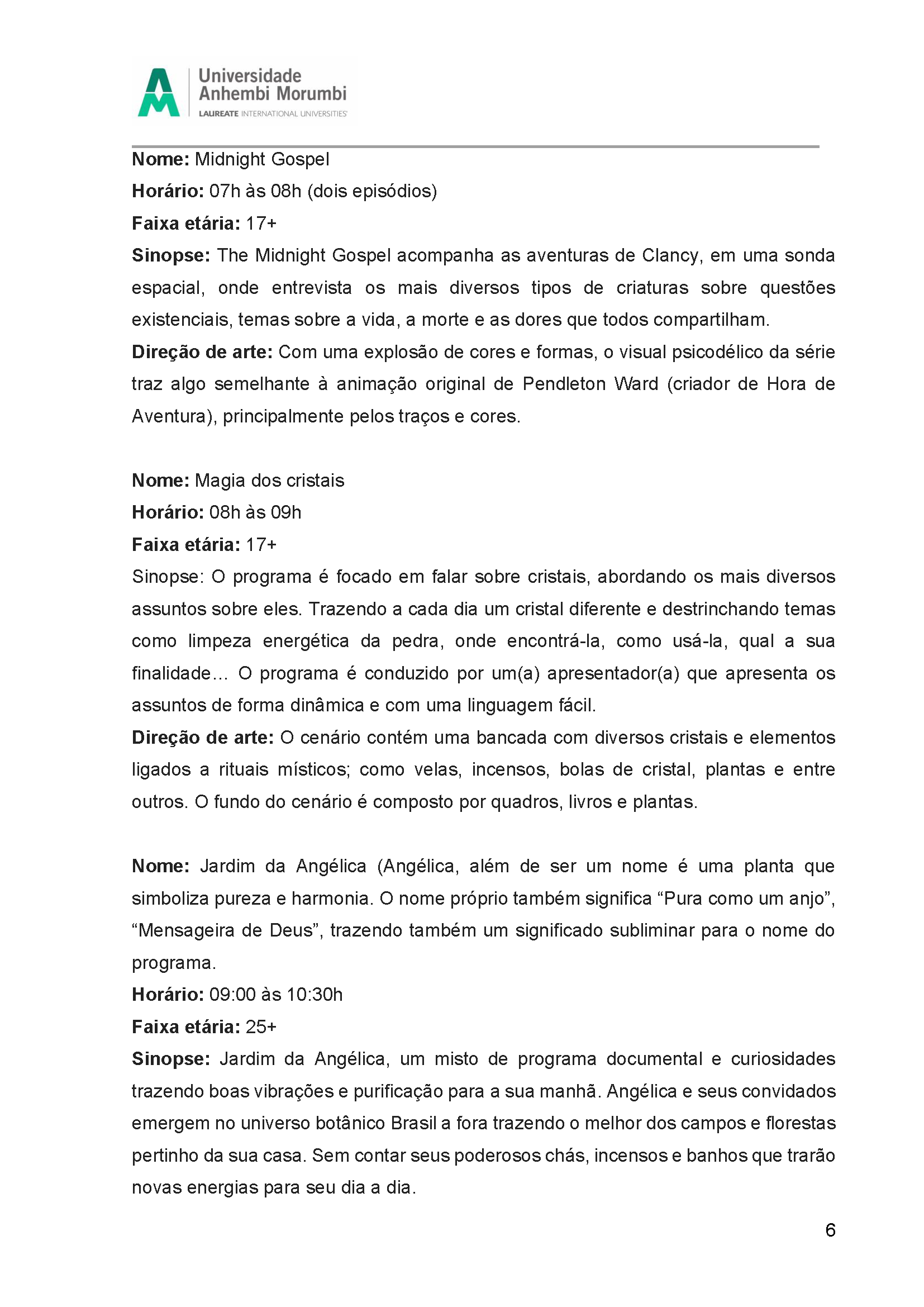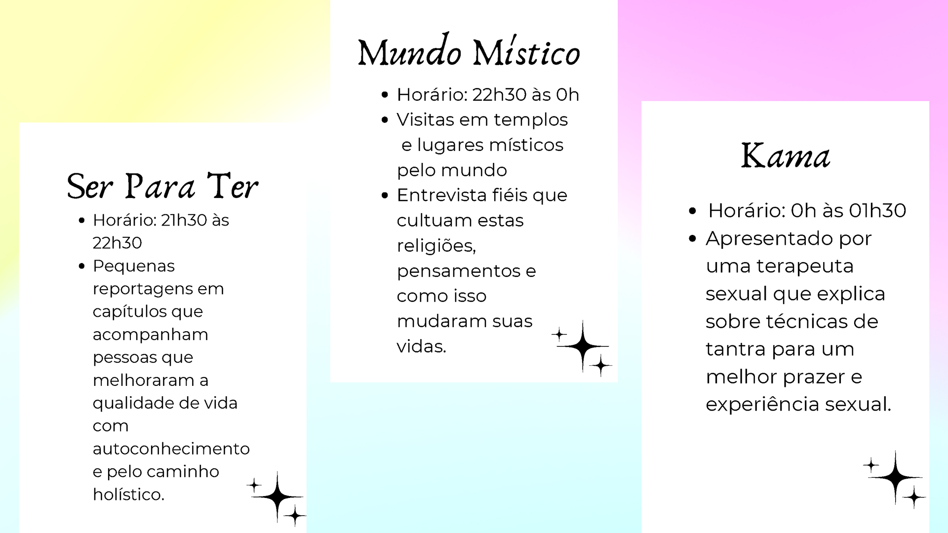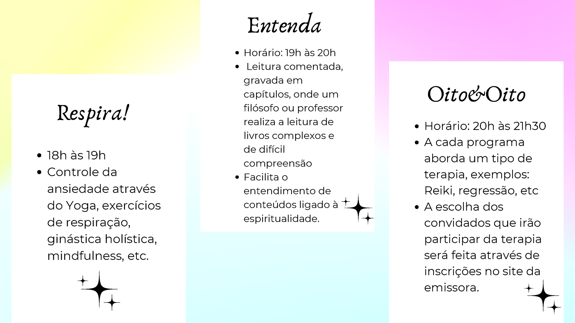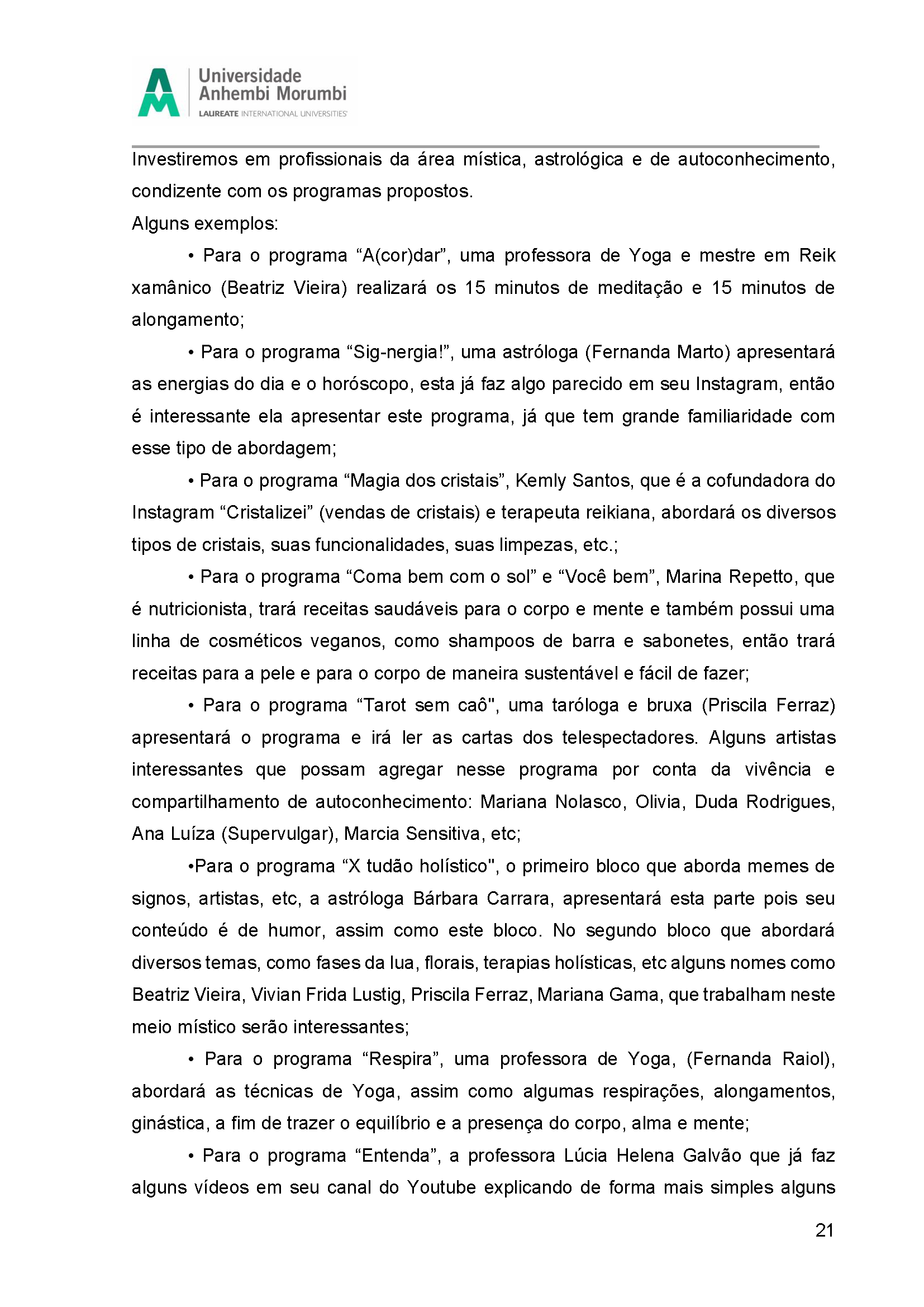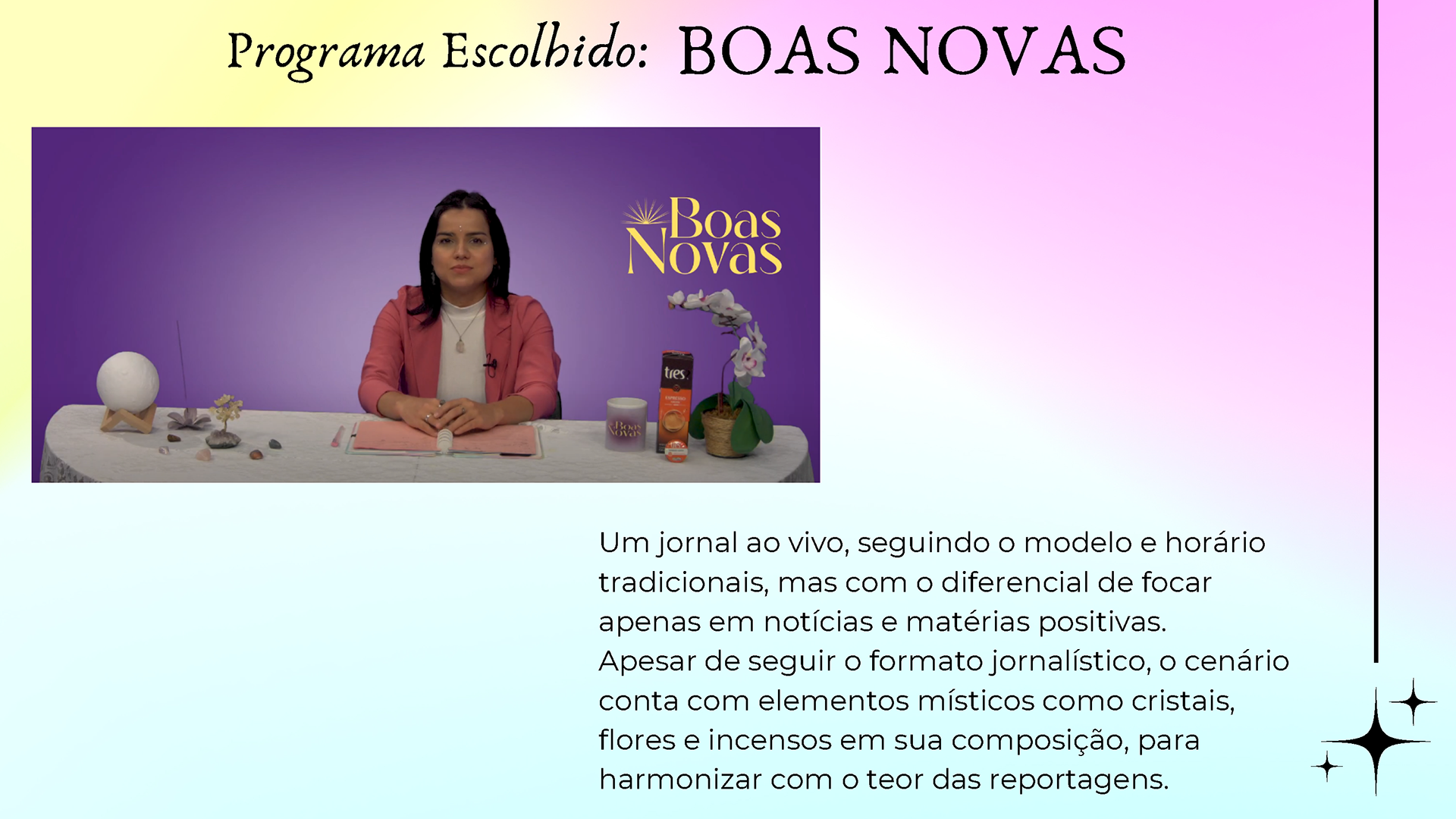 Fruto da disciplina de Programação, Audiência e Negócios foi criado como projeto piloto a Emissora Zen, que possui como base abordar o misticismo e autoconhecimento, estando junto com o seu expectador, acolhê-lo e introduzir em sua rotina o autoconhecimento, tanto pelo lado pessoal, como profissional e espiritual. Com isso, busca-se o equilíbrio entre corpo, alma e mente, sendo influenciada muito pela astrologia e o misticismo juntamente com a religiosidade.