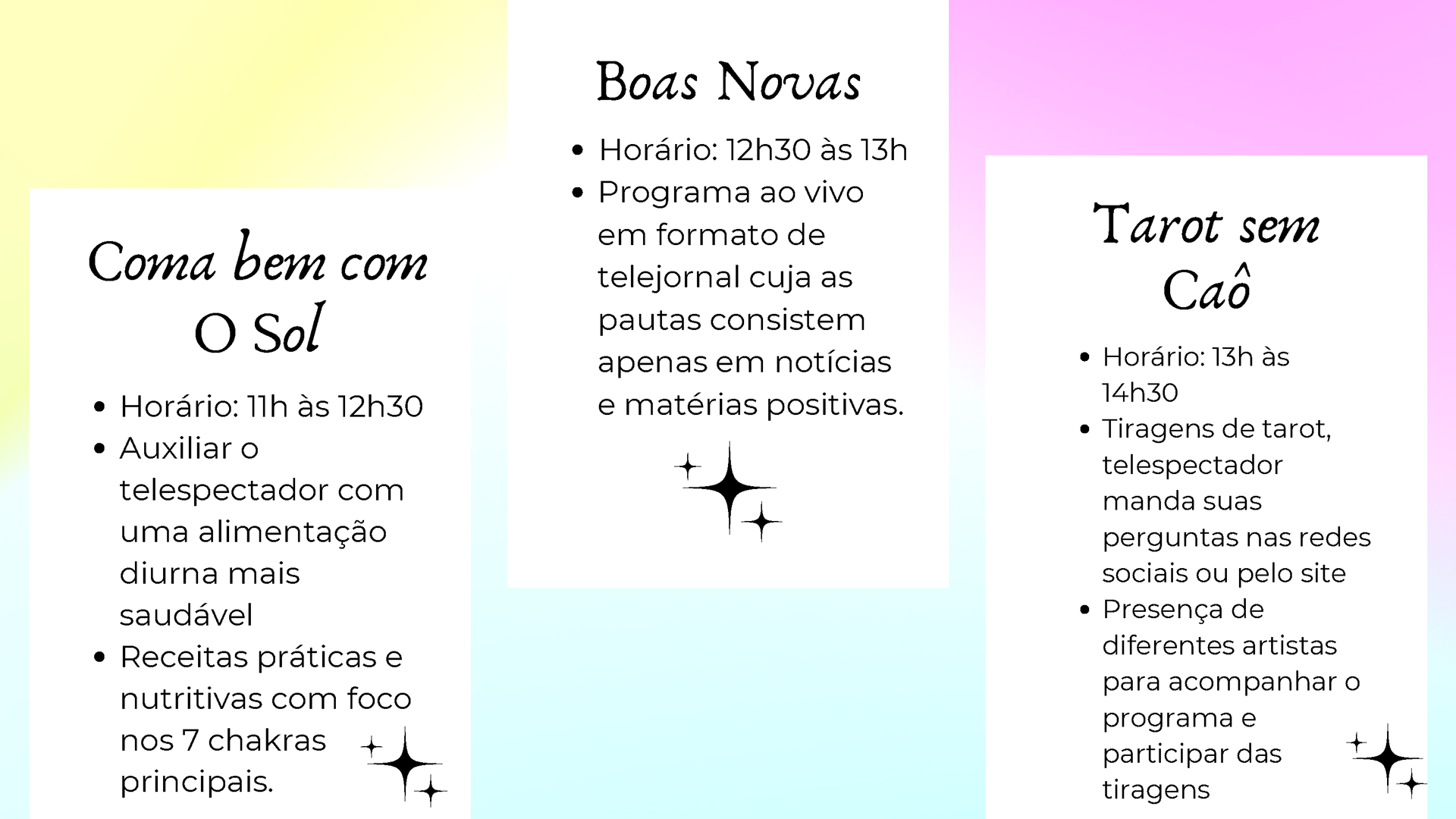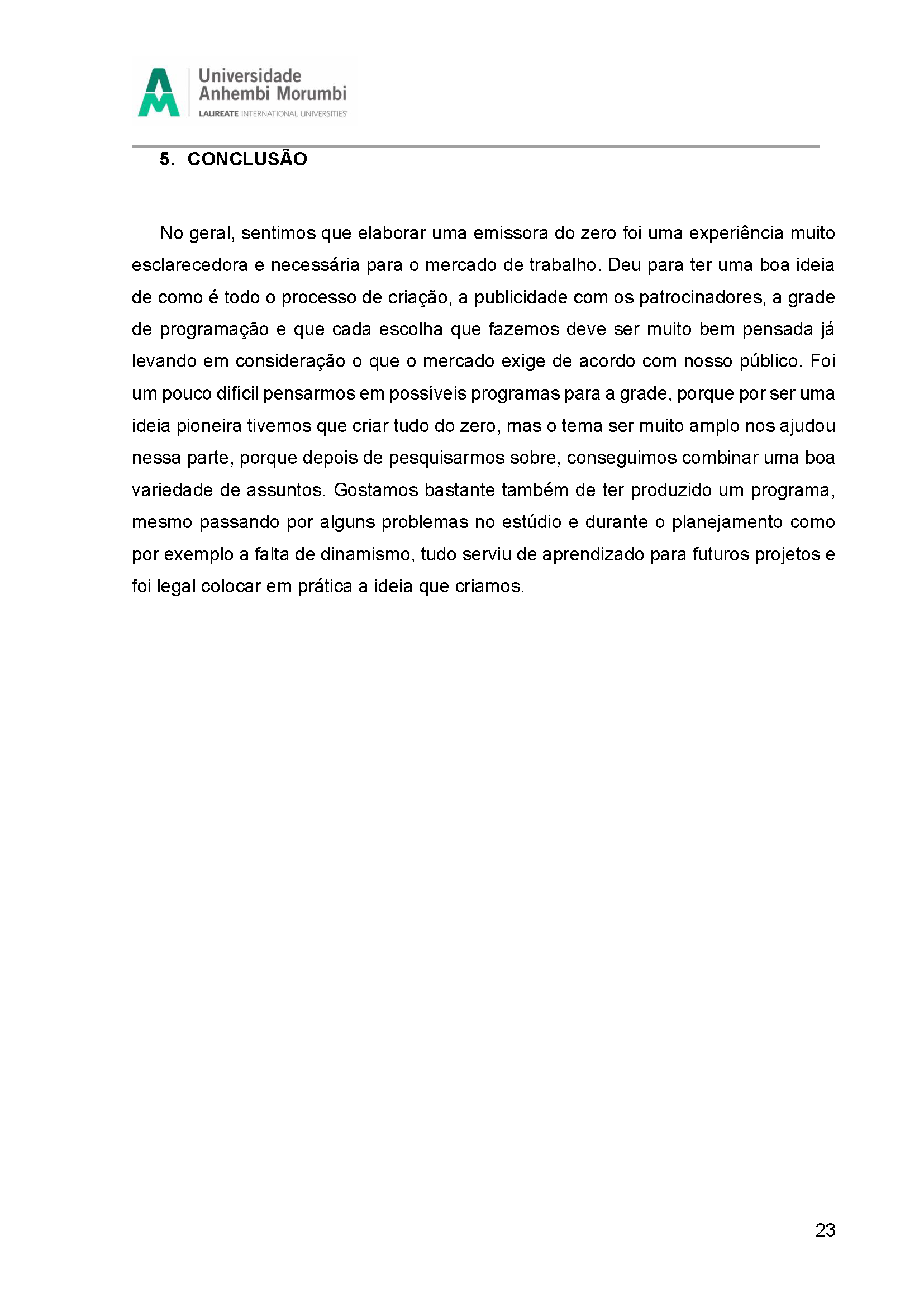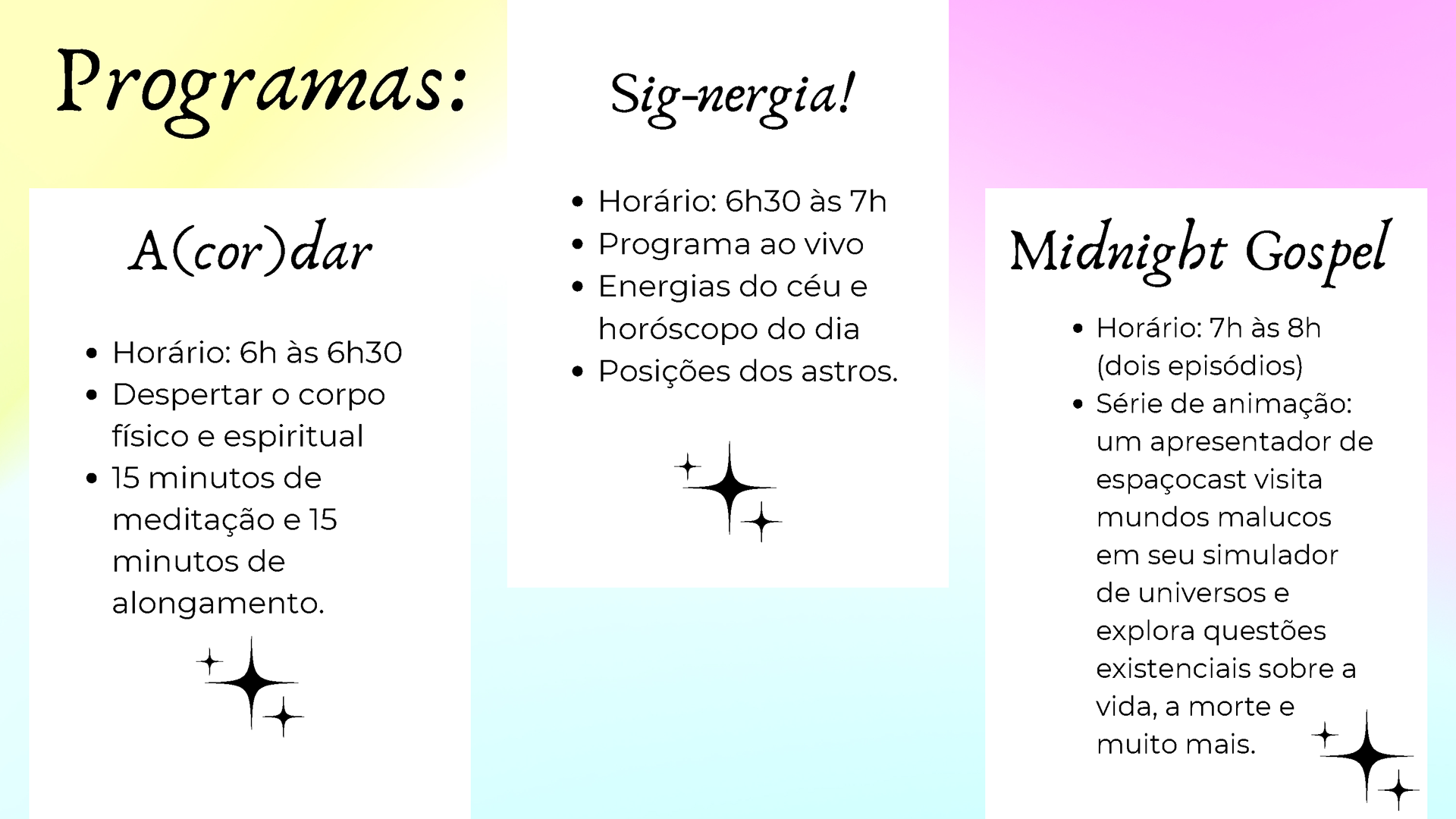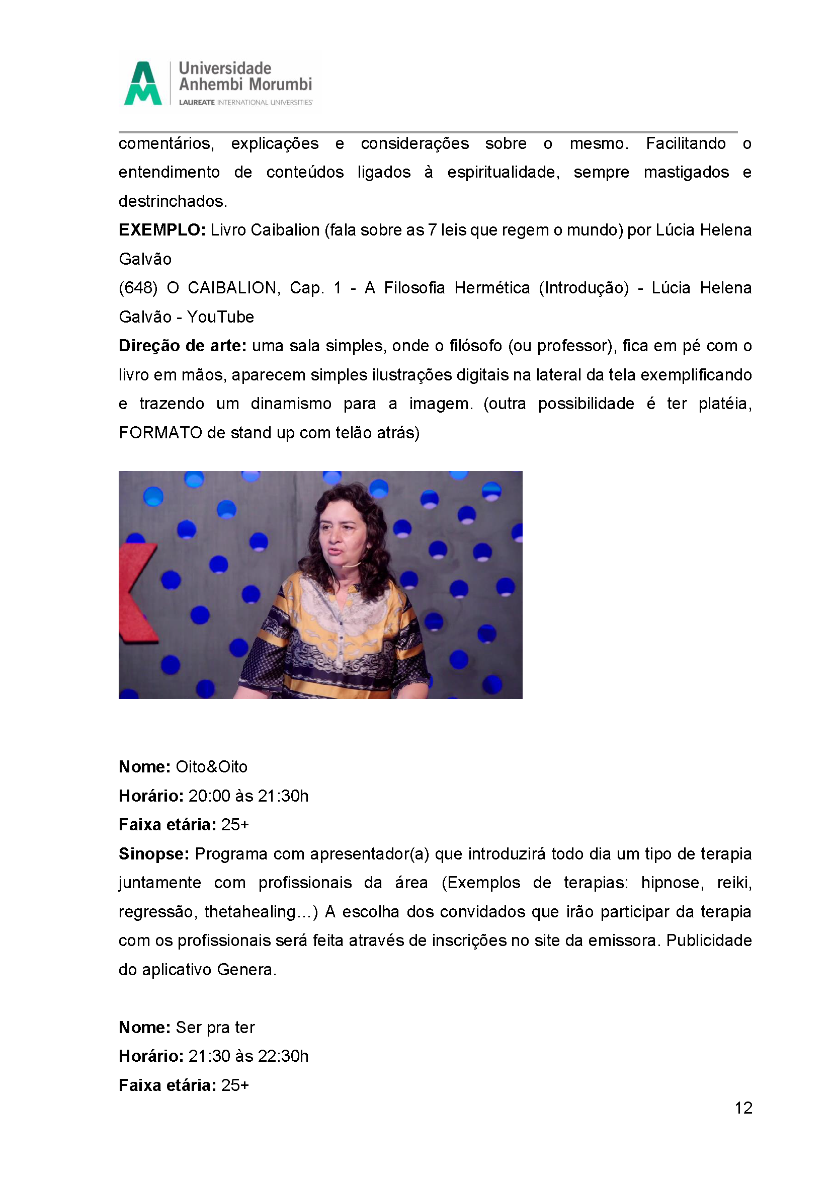 Fruto da disciplina de Programação, Audiência e Negócios foi criado como projeto piloto a Emissora Zen, que possui como base abordar o misticismo e autoconhecimento, estando junto com o seu expectador, acolhê-lo e introduzir em sua rotina o autoconhecimento, tanto pelo lado pessoal, como profissional e espiritual. Com isso, busca-se o equilíbrio entre corpo, alma e mente, sendo influenciada muito pela astrologia e o misticismo juntamente com a religiosidade.