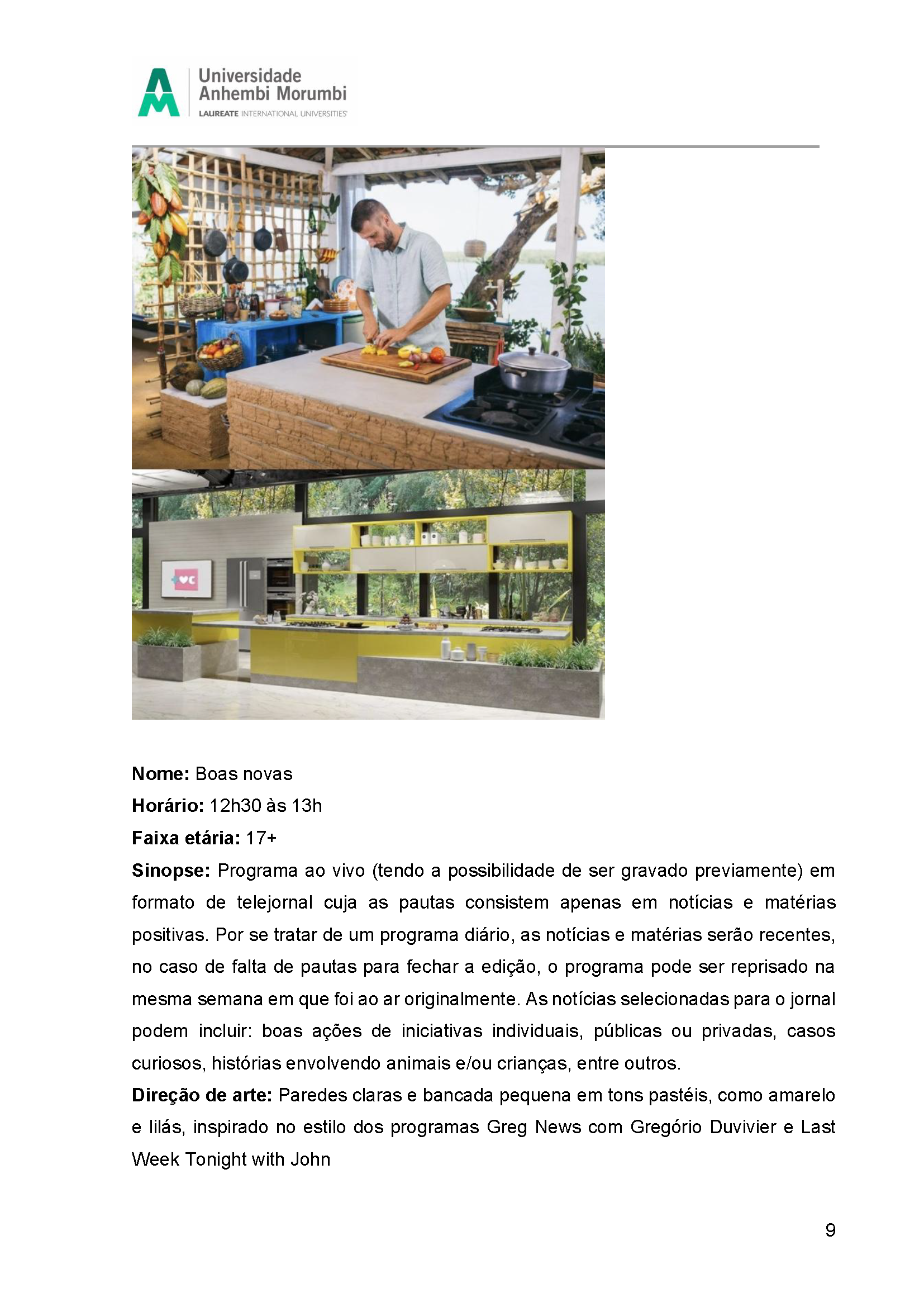 Boas Novas é um programa ao vivo (tendo a possibilidade de ser gravado previamente) em formato de telejornal cuja as pautas consistem apenas em notícias e matérias positivas. Por se tratar de um programa diário, as notícias e matérias serão recentes, no caso de falta de pautas para fechar a edição, o programa pode ser reprisado na mesma semana em que foi ao ar originalmente. As notícias selecionadas para o jornal podem incluir: boas ações de iniciativas individuais, públicas ou privadas, casos curiosos, histórias envolvendo animais e/ou crianças, entre outros.